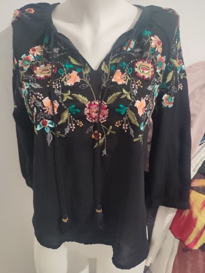 #kytieXSfemme. Chemise blouse manches 3/4 taille XS col avec cordon brodé avec des sequins en voile pas transparente le bas des manches se ferme par un bouton mesure des aisselles 45 cm hauteur 60 cm en excellente état comme neuve avec un petit col vide souple et très précis trop mignonne un petit peu plus courte dans le dos que sur le devant le dos mesure 54 cm et le devant 60 de marque Camaïeu ref H78