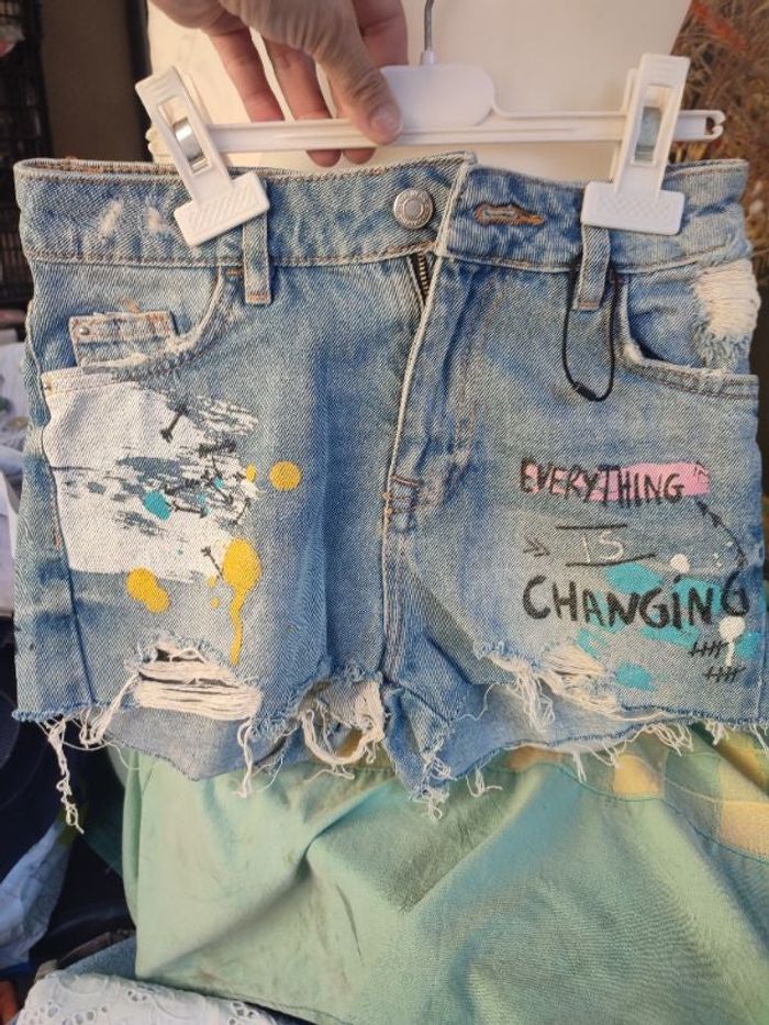 #kytie34femme. Short en jean taille haute taille 34 de marque stradivarius neuf zipper avec un bouton mesure de la taille 34 cm tour de cuisse 50 cm hauteur du short 35 cm griffer troué avec tache de peinture vraiment vraiment superbe ref 765B