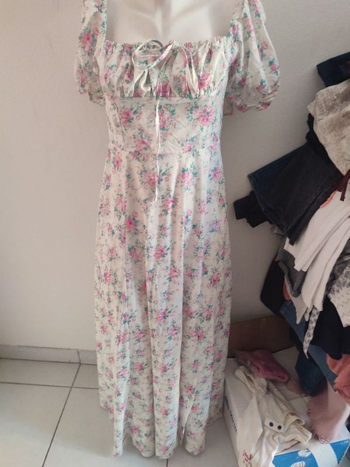 #kytieXSfemme. Robe longue ouverte taille XS satiné souple et fine et légère élastique au col avec un ruban manche ballon avec élastique au bras surpiqûre sous poitrine la robe est neuve mesure des aisselles 36 cm hauteur épaule bas 160 cm blanche fleurie se ferme par une fermeture éclair dans le dos ref G78