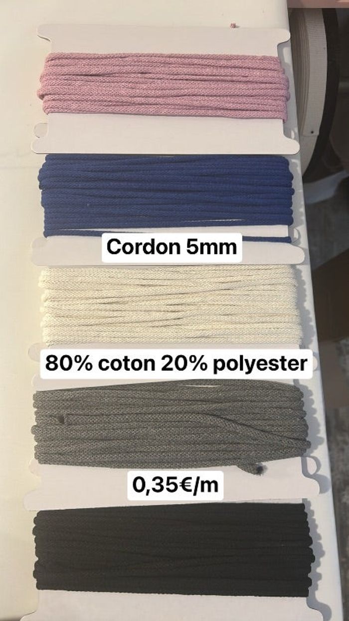 80% coton 20% polyester Chaque carte contient 10 mètres Épaisseur : 5mm