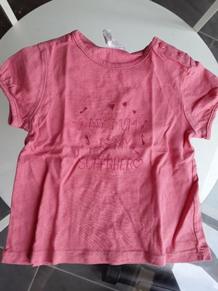 Tee- shirt manches courtes, rose avec inscription. Exellent état. Taille : 12 mois Aux choix dans mon dressing , 5 articles pour 8 euros sur tous les vêtements