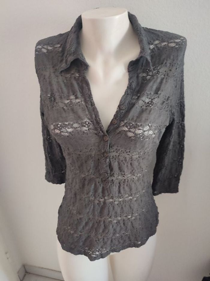 #kytie36femme. Chemise manche 3/4 taille 36 de marque promo de gris souris 🐁 effet dentelle mesure des épaules 36 cm mesure des aisselles 42 cm hauteur 60 cm colle V en état neuve avec des petits boutons au niveau des coudes ref P234