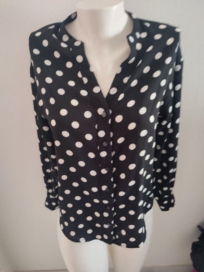#kytieXSfemme. Chemise blouse manches longues taille XS de marque Kiabi noir et noir fluide et souple col V Mesures des épaules 48 cm mesure des aisselles 45 cm hauteur 60 cm se ferme par des petits boutons devant un état neuf poignée se ferme aussi par des boutons ref T908