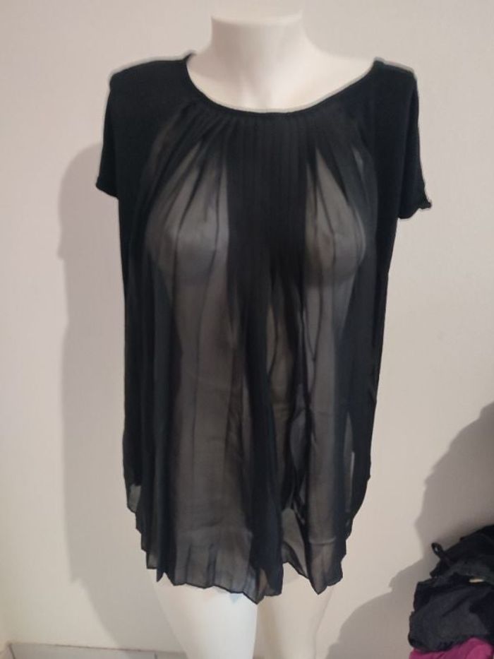 #kytieXSfemme. Tunique blouse manches courtes taille XS 2 matières de couleur noire effet petit pull léger derrière de matière manche courte voile un peu plus long sur le devant plissé au niveau du col qui est rond mesure des aisselles 48 cm hauteur de vent 65 cm arrière 70 cm en état neuf ref H14 de marque grain de malice