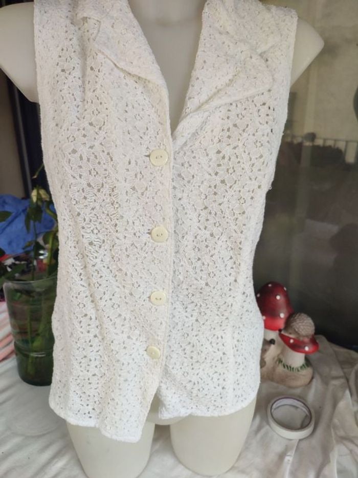 #kytie36femme. Chemise sans manche taille 36 sans marque de couleur blanche tout en dentelle 88 % coton 12 % polyamide avec un bouton de rechange avec ruban d'attache dans le dos se ferme par des boutons devant en parfaite état de couleur blanc en état neuf mesure des aisselles 40 cm hauteur de la chemisette 60 cm réf 89F