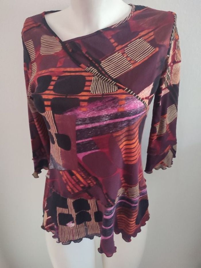 #kytie34femme. Tee-shirt manches mi long taille 34 de marque christine laure col rond envoie 100 % polyamide en état neuf sur piqûre au niveau des MI bras et croisé sur le devant volant sur piqûre sur le bas multicolore mesure des épaules 36 cm des aisselles 42 cm la hauteur 65 cm tout élastique réf 89 H