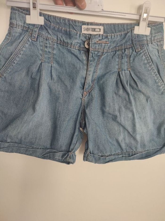 #kytie12ansfille. Short taille 12 ans short léger tissu jean souple de marque Okaïdi zippé avec un bouton poche avant et fausse poche arrière revers croisé au niveau des cuisses surpiqûre sur le devant a la taille en parfaite état réf 0C