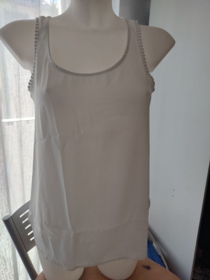 #kytieSfemme. Débardeur taille S 2 matières une matière fluide légèrement transparente sur le devant avec un liseret boule sur les manches et une matière t-shirt fluide sur le dos de couleur blanche en état neuve 93 % viscose 7 % élastique mesure des aisselles 42 cm hauteur 65 cm G très fluide et fin de marque Camaïeu ref 00Z