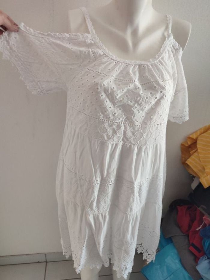 #kytieSfemme. Robe taille S/M de marque made in italy col brodé toute la robe est en broderie doublée 100 % coton épaule nue à bretelles de couleur blanc en excellente état comme neuve mesure des aisselles 45 cm hauteur de la robe 100 cm réf F4
