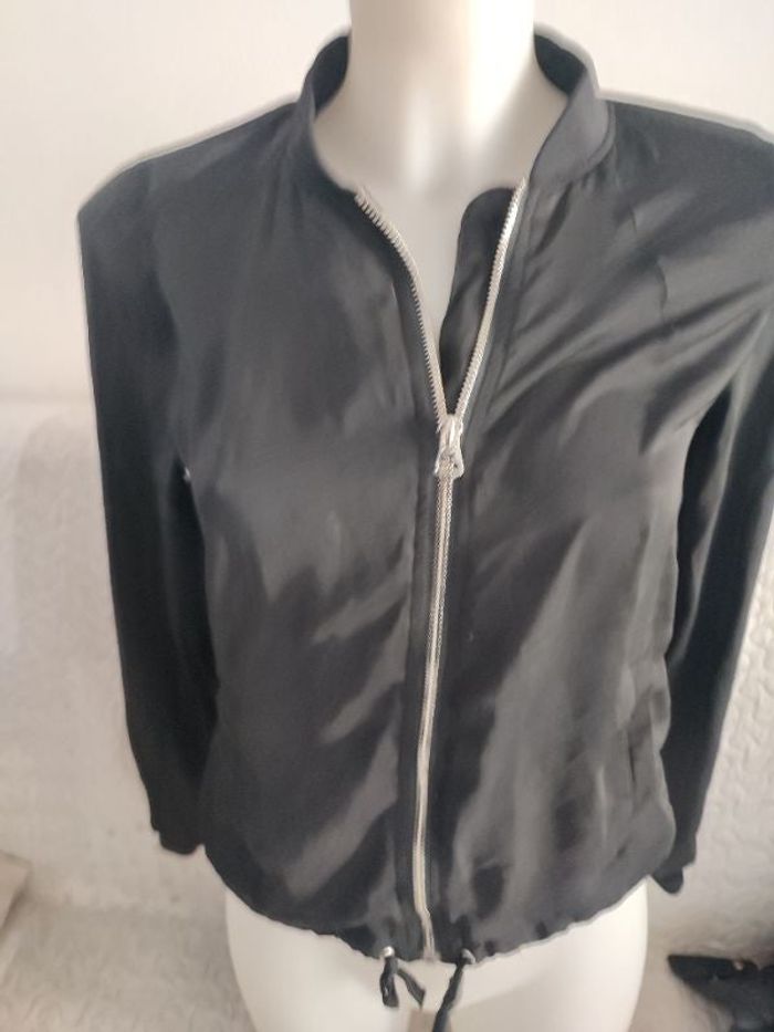 #kytie11ansfille. Veste manches longues taille 11/12 ans zippé poche avant de couleur noire de marque H&M hyper légère et fluide effet satiné avec cordon à la taille de réglage en parfaite état comme neuf ref Z 5