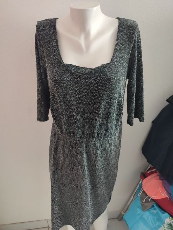 #kytie50femme. Robe manches 3/4 taille 50/52 de marque Kiabi de couleur noire et argenté en état neuve tailler élastique sur piqûre au niveau de la poitrine mesure des épaules 41 cm en élasthanne et en polyester élastique au max 56 cm mesure des aisselles 56 cm hauteur de la robe 95 cm mi saison souple et légère et fluide réf 216D