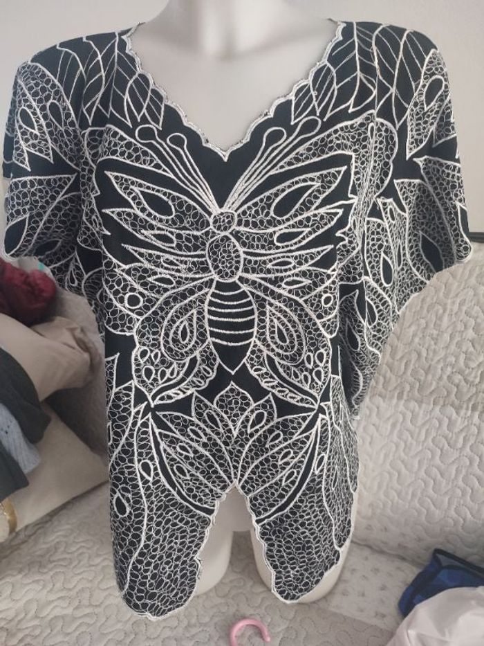 #kytieLfemme. Chemise blouse manches courtes taille L/XL col V 2 couleur noir brodé blanc 100 % coton et fil de coton et ses papillons ouverts sur le devant et l'arrière en bas mesures des aisselles 62 cm hauteur 65 cm en état neuf ref W70