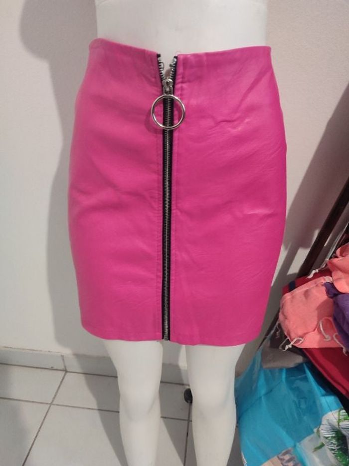 #kytieMfemme. Jupe en simili taille M de couleur rose se ferme sur tout le devant par une fermeture éclair en état ne veux mesure taille 38 cm hauteur taille bas 45 cm hanches 92 cm en état neuve 97% polyester 3% elasthane réf T49