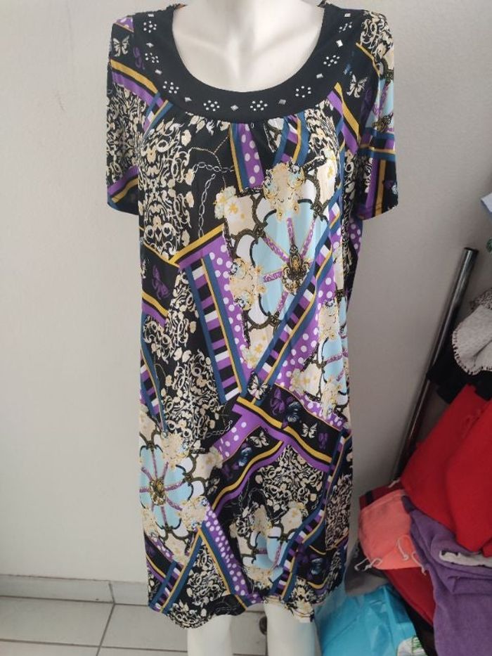 #kytieXLfemme. Robe manches courtes taille XL de marque E&D col rond perle au col neuve multicolore souple et fluide fine hyper confortable 80% viscose 15% polyester 5% elasthane mesure épaules a épaules 44 cm esselle a esselle 54 cm hauteur épaule bas 100 cm réf G45