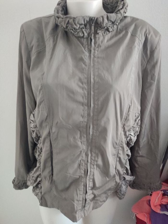 #kytie46femme. Veste manches longues taille 46 de marque Riu de couleur taupe beige brillant doublé foncé sur les côtés au col et aux poignets zippés en état neuve 100% polyester mesure des épaules 46 cm esselle a esselle 58 centimètres hauteur 70 cm poche zippée sur le devant épaulette en mousse effet glacée ref 12 H