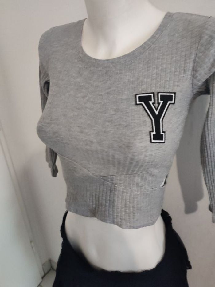 #kytieXSfemme. Top court manche longue taille XS de marque Jennyfer de couleur gris clair avec une petite ouverture sur les côtés en excellente état comme neuf côtelé mesure épaules a épaules 32 cm et celle à SL 34 cm hauteur 40 cm réf 12A