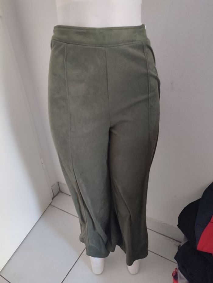 #kytie38femme. Pantacourt taille 38 bas large de marque Bershka neuf matière peau de pêche 🍑 de couleur kaki se ferme par une fermeture éclair sur le côté gauche mesure de la taille 38 cm tour de cuisse 66 cm longueur 85 cm largeur du bas 60 cm arrive au niveau des mollets ref D42