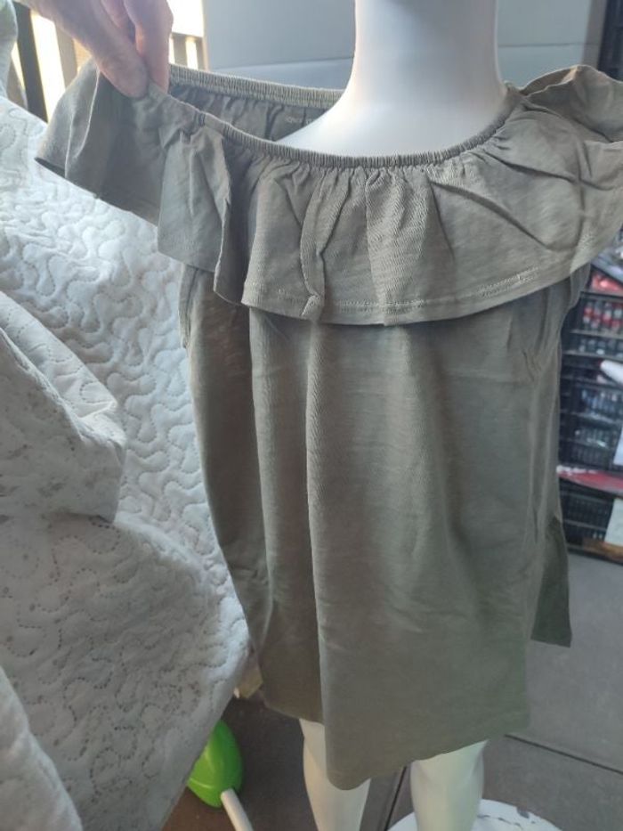 #kytie12ansfille. Haut sans manche taille 12 ans de couleur gris taupe avec un petit volant qui fait le tour du coup de marque Monoprix ref F23