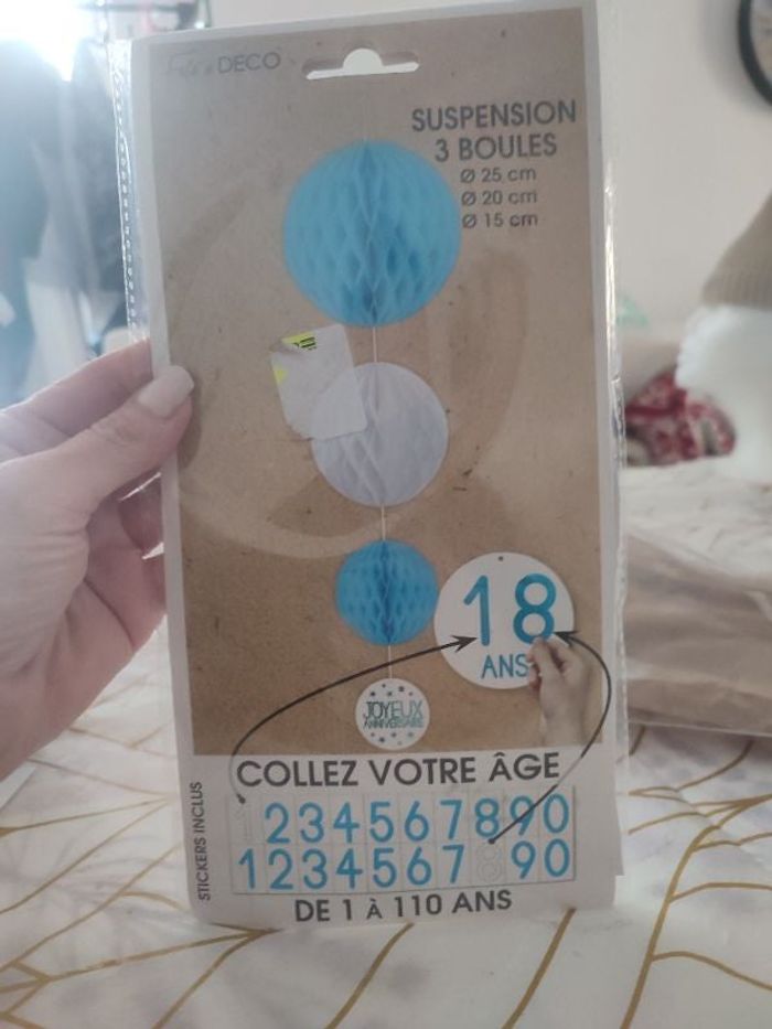 #kytieaccessoirefete. 1 suspension triple en papier d anniversaire bleu turquoise et blanche en papier neuve 1 de 25 cm 1 de 20 cm et 1 de 15 cm de marque fête a deco