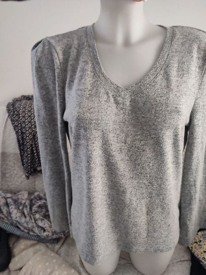 #kytieSfemme. Tunique taille S de couleur gris col V de marque Kiabi ouverture dos dans le cou au dos de couleur gris chiné blanc souple mi-saison 100 % polyester matière effet polaire ras très doux fluide en superbe état comme neuf en état neuf mesure des épaules 40 cm se porte un peu large mesure des aisselles 46 cm hauteur 60 cm surpiqûre dans le dos où il y a l'ouverture on peut le mettre devant derrière ou derrière devant la tunique est réversible mange un peu l'argent pas mesure des poignées 40 cm arrive un peu au-dessus des poignets c'est oversize réf P38