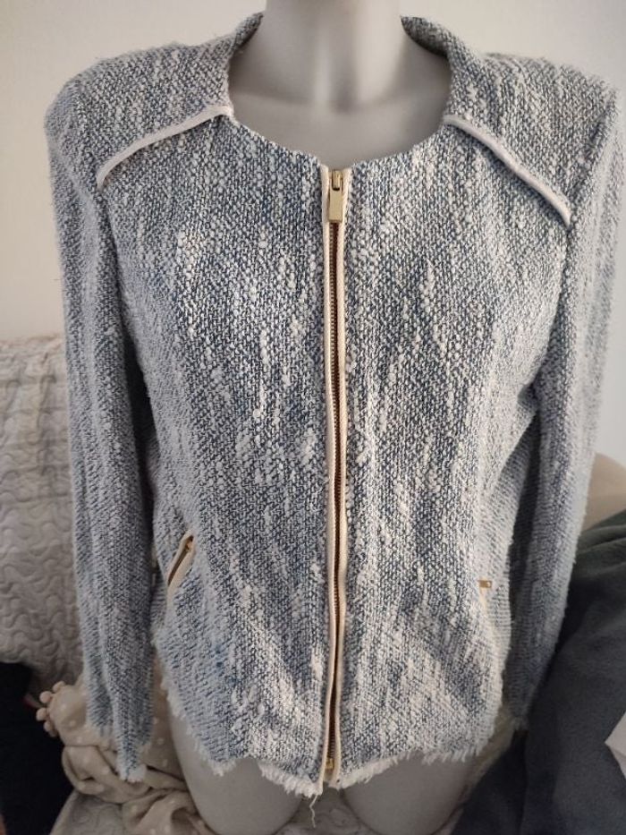 #kytie42femme. Veste blazer taille 42 de marque rêver the lune effet Chanel style Chanel zippé sur le devant zippé aux poches avant frangin sur le bas de la veste et le bas des manches surpiquet avec petit rabat les oreilles blanc au niveau des épaules sur le devant mousse et Paulette on peut les retirer vous pouvez couper le petit fil si vous les voulez pas de couleur bleu ciel et blanc mesure des épaules 42 cm mesure des aisselles 46 cm hauteur de la veste 60 cm en excellente état réf D315