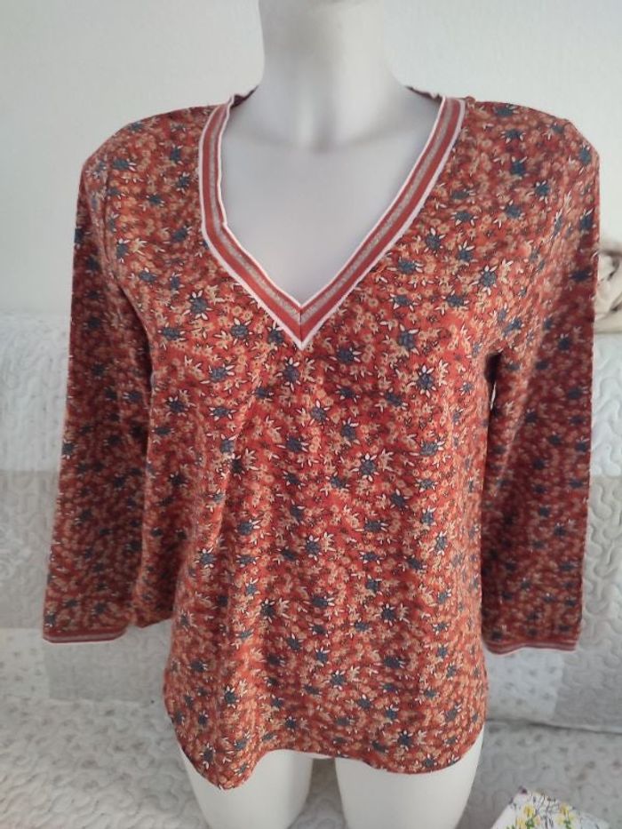 #kytieMfemme. Chemise blouse manches longues taille M de marque Season 100 100 % polyester effet gaufré quadrillé avec de petites paillettes sur le col et sur les manches argentées la chemise rouge est en état neuf mesure des épaules 38 cm mesure des aisselles 46 cm hauteur 60 cm on voit un peu épais pas transparente de couleur marron orangé avec de petits fleurs grises et blanches ref J45