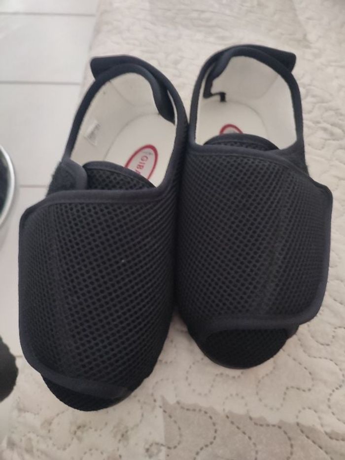 #kytie36chaussurefemme. Chaussures taille 36 orthopédique de marque gibaud en éponge intérieur la semelle et les contours de la chaussure l'extérieur en tissu alvéolé nid d'abeille de couleur noire à velcro sur le devant et le talon pour plus de facilité à mettre le chausson avec une semelle de 3,5 cm ce sont des chaussures pantoufles on peut aussi marcher dehors avec bien évidemment les chaussures sont neuves ref K34