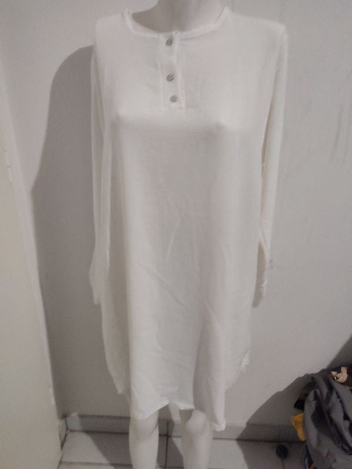 #kytietailleuniquefemme. Robe tunique manches longues taille unique de couleur blanc neuve 95 % polyester 5 % elasthan c'est légèrement transparente hyper souple et fluide effet satiné mat ure des épaules 44 cm mesure des aisselles 60 cm hauteur de la tunique 90 cm avec un passant de chaque côté pour pouvoir mettre une ceinture la tunique devient une robe de marque aucune la tunique est neuve convient à une taille 42/44 Réf GT21