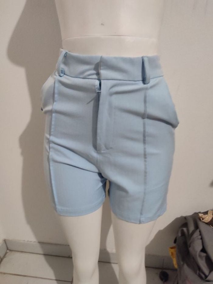 #kytieSfemme. Short Chino taille S de marque H&M dégriffé de couleur bleu ciel zippé avec un bouton et une accroche surpiqûre sur le devant tout le long du short un petit peu évasé vers le bas pas beaucoup poche avant fausse poche arrière mesure de la taille 34 cm tour de cuisse 50 cm hauteur 45 cm le short est neuf Ref F34