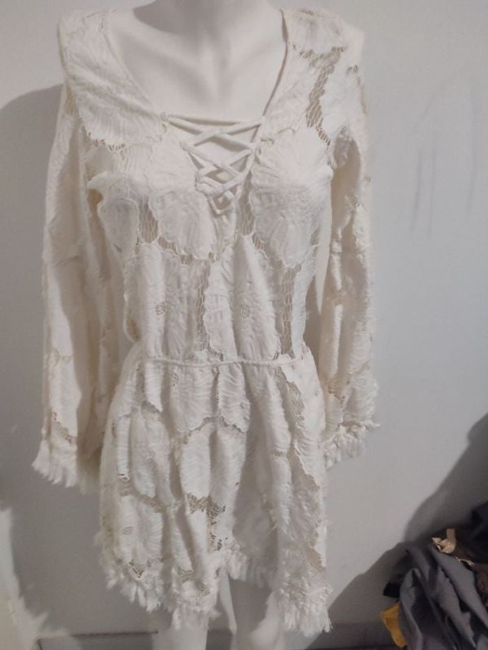 #kytieMfemme. Robe manches longues taille M de marque Lili fama de couleur écru la robe est tout en dentelle évasée du coude au poignet la robe est en état neuve se ferme par un cordon dans le dos col V avec cordon sur le devant niveau de la poitrine tressée mesure des aisselles 40 cm mesure hauteur 85 cm la largeur des manches évasées et de 60 cm de contour avec frange brodé en fil de coton laver à la main à froid la faire sécher la pendre ne pas repasser en fil de coton valeur de la robe 289 € Ref E 21