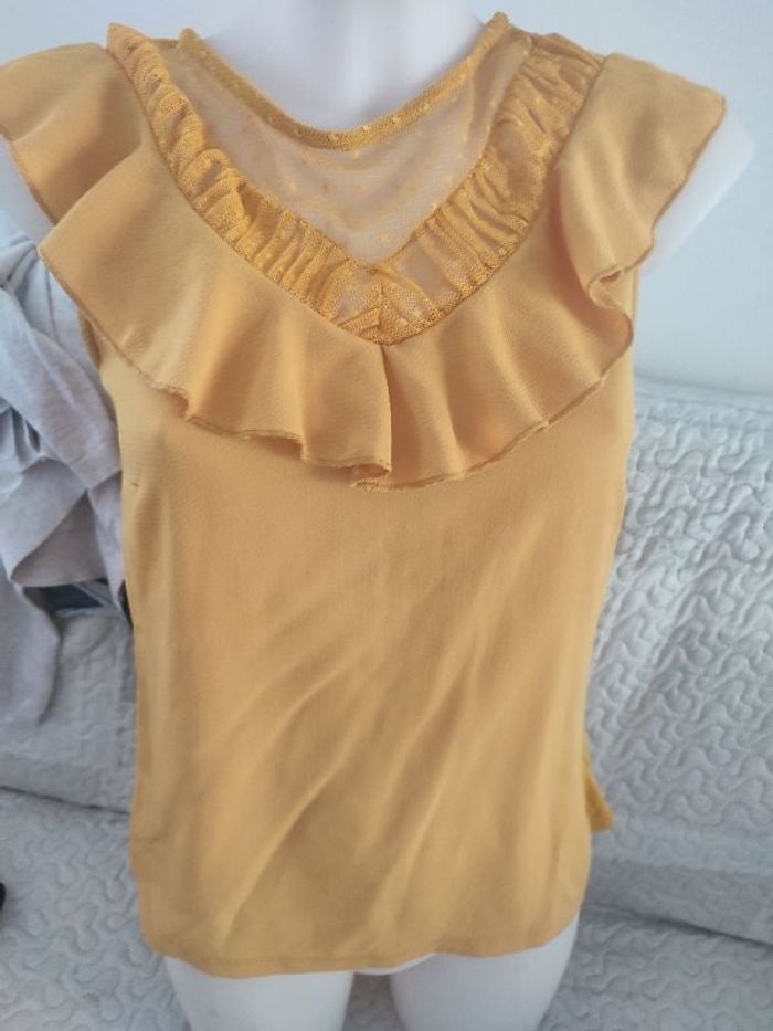 #kytieSfemme. Haut sans manche taille S de marque Naf Naf de couleur moutarde bi matière le devant nid d'abeille le derrière matière t-shirt col rond avec voile alvéolé sur le col avec de la broderie un volant en dessous au niveau de la poitrine surpiqué mesure des épaules 36 cm mesure des aisselles 40 cm hauteur du haut 60 cm en superbe état Ref D124
