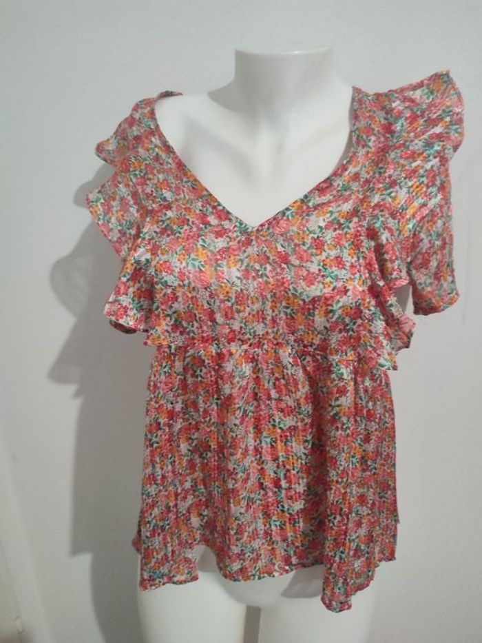 #kytieSfemme. Tunique blouse manches courtes taille S/M de marque peace and love 100 % polyester envoie le non transparente avec volant sur le devant des épaules sur piqué plissé colle V Fleury de couleur à rouge pailleté argent car tout le long elle est en fil argenté fondu dans le tissu mesure des épaules 38 cm mesure des aisselles 46 cm la hauteur est de 65 cm la tunique est neuve peut-être légèrement transparente je dis bien peut-être selon ce qu'on a en dessous (ref204)