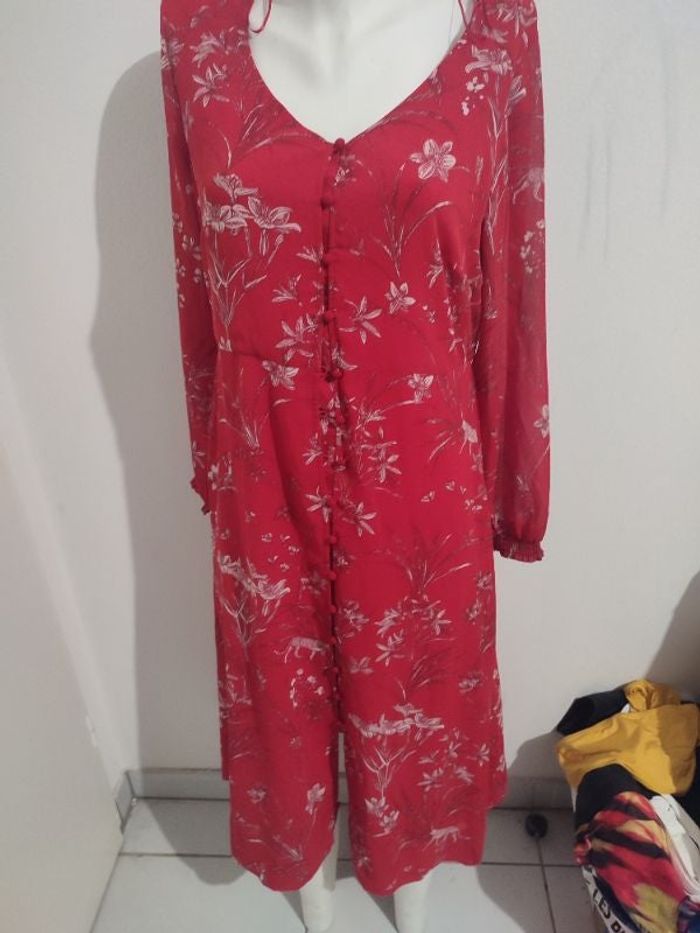 #kytie40femme. Robe longue manches longues taille 40 de marque comma Fleury de couleur rouge les manches sont en voile les poignées sont élastiques le voile devant et 100 % viscose l'intérieur de la doublure et 100 % polyester mesure des épaules 42 cm des aisselles 46 cm hauteur de la robe 120 cm surpiqûre au niveau de la poitrine de couleur rouge et blanche se ferme par des boutons sur tout le devant en parfaite état comme neuve