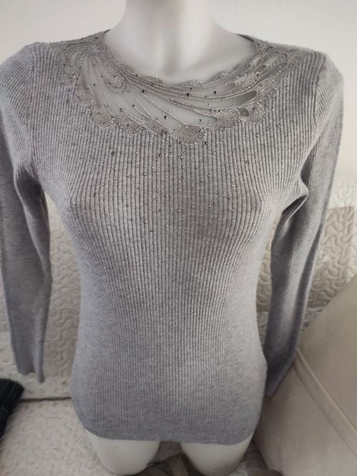 #kytie34femme. Petit pull léger taille 34/36 sans marque coller rond avec du voile alvéolé sur le col avec de la broderie le plus les côtelé de couleur gris en parfait état avec de perles gris miroir sur le col 50 % viscose 40 % polyamide 10 % est la Stan le petit pull est en parfaite état comme neuf mesure épaules a épaules 34 centimètres esselles a esselles 40 centimètres hauteur épaules bas 65 centimètres