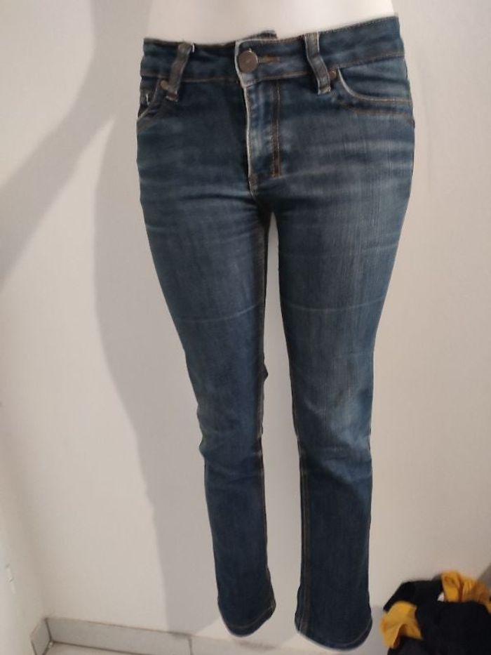 #kytie34femme. Jeans taille 34 mesure taille 38 cm de marque décontract en parfaite état se ferme par une fermeture éclair et un bouton devans poche avant et arrière jeans 👖 Droit confort souple taille basse mesure tour de cuisse 52 cm hauteur taille cheville 90 cm used entre jambes tour de cheville 30 cm