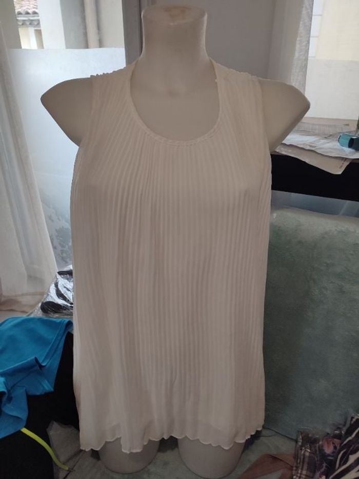 #kytieMfemme. Haut tunique plissée taille M de marque Zara fluide s'attache par un petit bouton dans le cou en voile devant et derrière doubler peut-être légèrement transparente mesure des aisselles 40 cm hauteur de la tunique one plissée 65 cm la doublure polyester 70cm la tunique est en état neuf de couleur blanc
