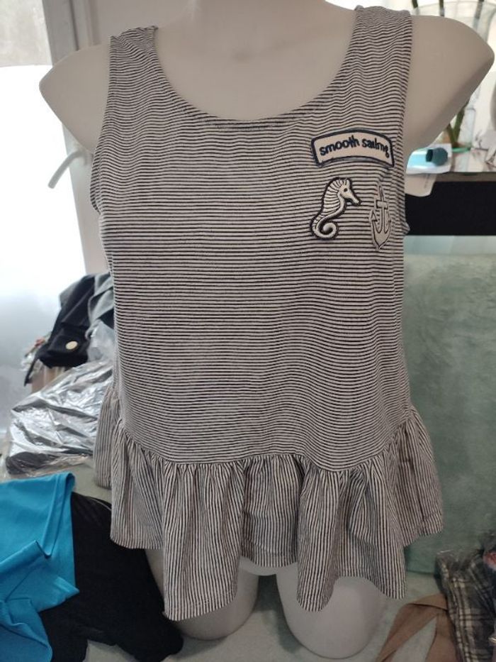 #kytieMfemme. Haut bretelles taille M de de marque Kiabi de couleur blanc et bleu marine rayé en superbe état en coton et polyester avec un petit volant sur le bas mesure des aisselles 40 cm hauteur 55 cm