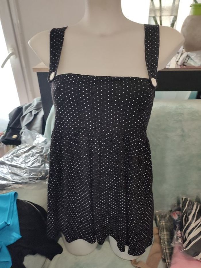 #kytieMfemme. Tunique taille M de marque inextenso de couleur noire à pois blanc légère un bouton et cousu en décoration sur le devant en très très bon état 92 % viscose 8 % et la Stan les bretelles ne se règle pas fluide très souple mesure des aisselles 38 cm hauteur de la tunique 65 cm
