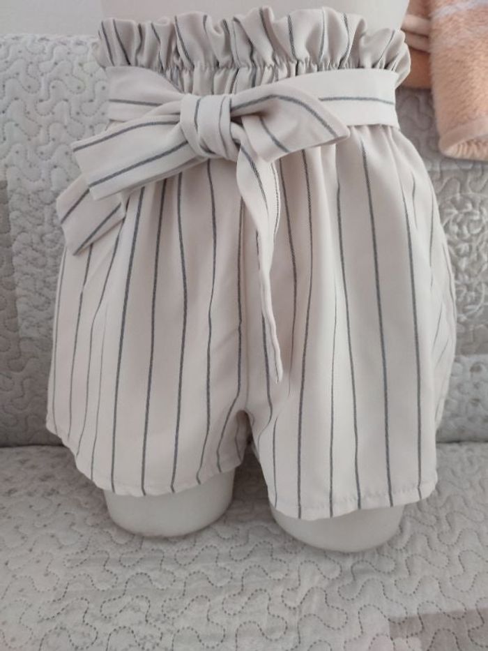 #kytieXSfemme. Short taille XS/S ça élastique de couleur blanc et cru rayé gris bleu mesure de la taille 30 cm élastique tiré au max 40 cm avec sa ceinture hauteur du short 40 cm marque aucune en parfaite état léger et fluide un peu épais pas trop