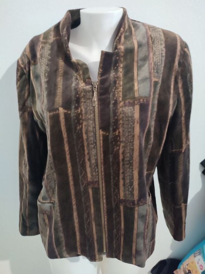 #kytie40femme. Veste taille 40 de marque Guy dubouis on veut Laura de couleur marron intérieur 100 % polyester satin marron zippé avec petite épaulette en mousse sur les épaules poche avant mesure des épaules 44 cm des aisselles 54 cm hauteur de la veste 70 cm longueur des manches poignée ras de l'épaule 60 cm la veste est en état neuf 100 % coton