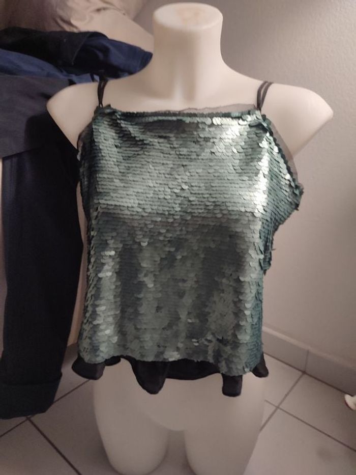 #kytieMfemme. Top bretelles taille M tout en sequin surpiqué de couleur vert brillant avec doublure en voilage avec un volant sur le dessous les bretelles se passent dans le dos avec un petit nœud sur l'épaule droite 100 % polyester mesure des aisselles 45 cm hauteur 40 cm de marque Mango en état neuf