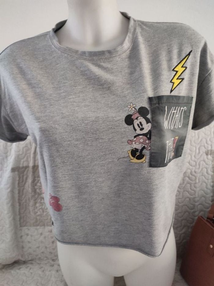 #kytieSfemme. Tee-shirt court manches courtes taille S de marque Disney en très bon état de couleur gris colorant reverse sur les manches mesure du t-shirt et celle à aisselle 52 cm hauteur du t-shirt 50 cm le t-shirt et oversize avec une poche gauche sur la poitrine