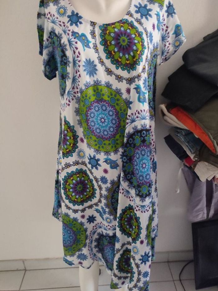 #kytieSfemme. Robe manches courtes taille S/M col rond de marque freestyle 100 % coton léger et très très fine robe de maison mesure des épaules 40 cm peut convenir aussi un 38 mesure des aisselles 55 cm longueur de la robe qui est un petit peu biseauté fluide souple vraiment hyper confortable leur robe de maison d'été ou même dehors avec un legging en dessous 125 cm de longueur la robe est neuve