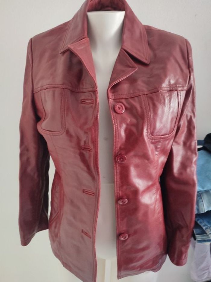 #kytieMfemme. Veste en cuir taille M de marque forside en cuir dessus Buffalo du buffle cuir de buffle intérieur matelassé doublure acétate avec une poche du côté droit une poche de chaque côté de la poitrine sur le devant deux poches avant vintage de couleur bordeaux en parfaite état état du neuf mesure des épaules 42 cm mesure des aisselles 46 cm hauteur 75 cm effet légèrement vieilli sur le dessus des épaules et le bras droit vraiment vraiment au top