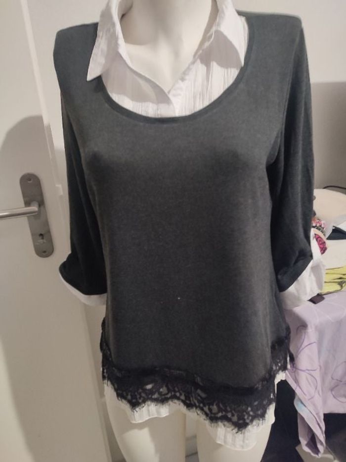 #kytieMfemme. Tunique t-shirt chemise taille M manche 3/4 se faire ma part un petit bouton coller rond colle chemise collevé incorporer de couleur blanche froissé la tunique et de couleur gris clair à la mesure des épaules et de 38 cm des aisselles et de 46 cm de hauteur et de 65 cm de marque comme d'hab le bas de la tunique et moitié en chemise froissé moitié en dentelle sur 7 cm et en ce qu'un noir sur 2 cm la tunique est neuve souple légère et fluide