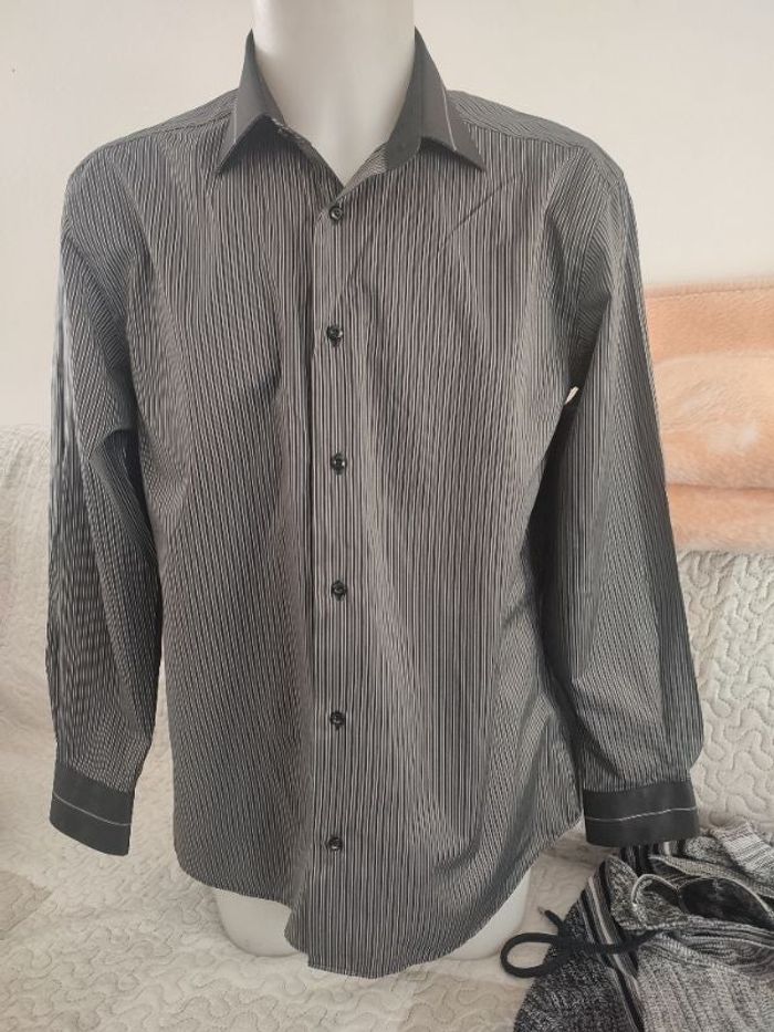 #kytie40homme. Chemise manche longue taille 41/41 de marque cap 10 Ten 2 couleurs gris anthracite rayé noir argenté et fait satiné la chemise est neuve mesure des épaules 52 cm mesure des aisselles 56 cm hauteur de la chemise 70 cm longueur des manches épaule poignet 60 cm se ferme par des boutons devant 80 % coton 20 % polyester