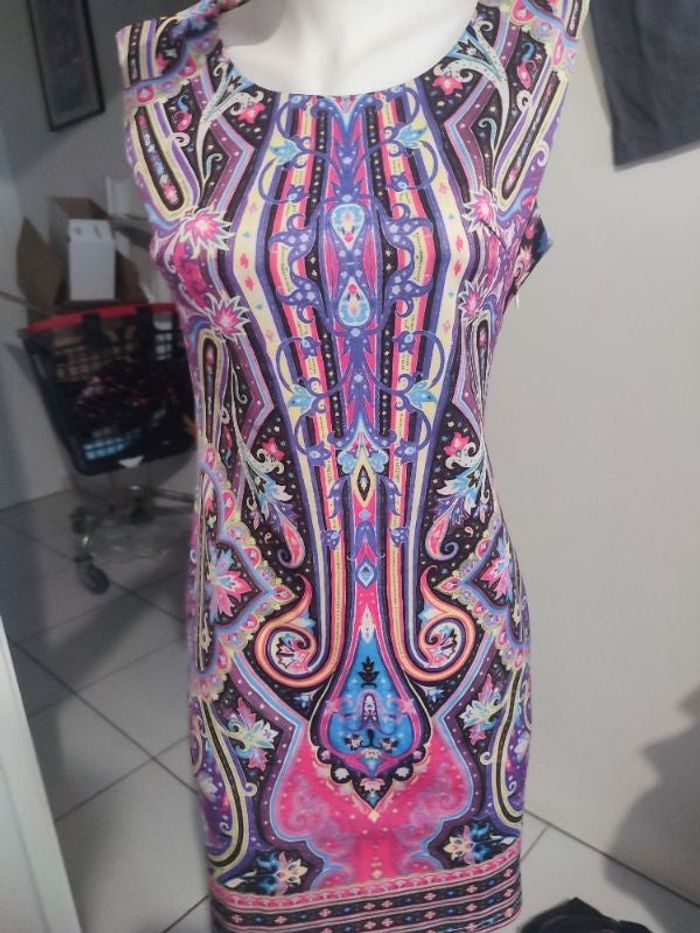 #kytieMfemme. Robe sans manche taille M de marque sweet miss 95 % polyester 5 % élasthanne la robe est neuve d'ailleurs mesure des aisselles 44 cm hauteur des épaules 40 cm hauteur de la robe 90 cm sur piqûre au niveau de la poitrine très douce et fait satiné mes mat ça fait un peu un style de robe tablier