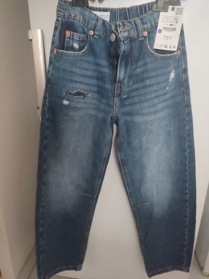 #kytie11ansfille. Jeans baggy fit taille 11/12 ans de marque Zara griffé sur les cuisses le jean est neuf je l'ai acheté hier à la date du samedi 9 décembre 2023 le jean est trop petit ma fille ayant coupé les étiquettes je ne peux pas le changer au magasin le dîner neuf avec étiquette je le vends au prix d'achat taille réglable par élastique se ferme par une fermeture éclair et un bouton cuisse large mesure de la taille 34 cm tour de cuisse 52 cm longueur 85 cm cheville 34 cm