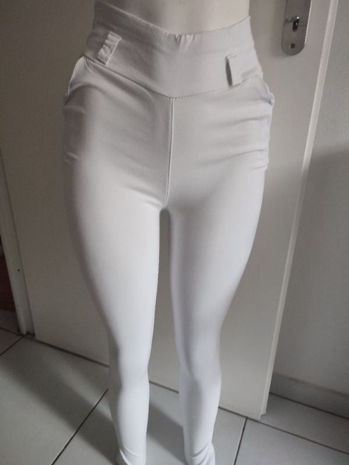 #kytieXXSfemme. Pantalon taille XS/ sans marque de couleur blanc légèrement transparent poche avant passant pour la ceinture en coton et en nylon mesure de la taille 32 cm élastique tirer au max 38 tour de cuisse 40 cm longueur 100 cm tour de cheville 25 cm le pantalon est neuf legging