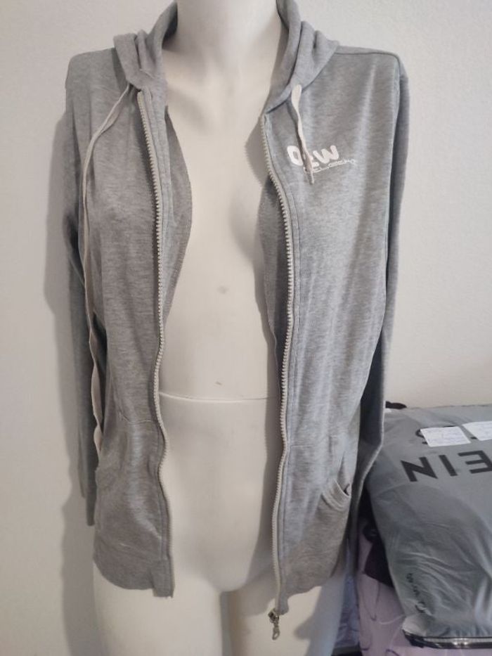 #kytie38femme. Gilet a capuche sweat manche longue taille 38/40 zippé capuche et cordon le gilet est léger de marque OTW athletic mesure des épaules 40 cm mesure des aisselles 52 cm hauteur 65 cm poche avant mesure des manches poignée jusqu'au cou 75 cm en très très bon état